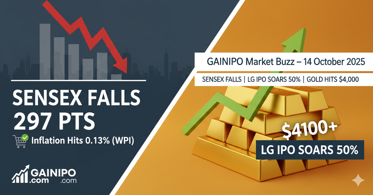 GAINIPO Market Buzz — Sensex Falls 297 Pts, Gold Surges, LG IPO Steals Spotlight | 14 October 2025