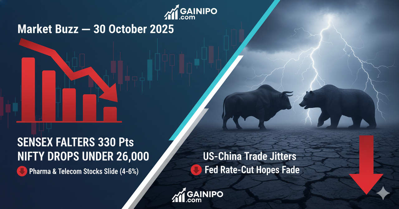 GAINIPO Market Buzz — Sensex Falters 330 pts, Nifty Drops Under 26,000; Pharma & Telecom Stocks Slide | 30 October 2025